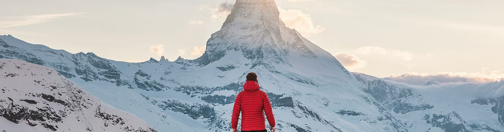 A person wearing a red jacket stands on a snowy hilltop, gazing at the iconic Matterhorn peak during sunrise or sunset. The surrounding landscape is covered in snow, with the mountain illuminated by soft light.